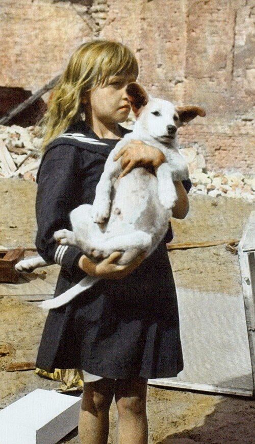 Dívka držící psa v sutinách domů zničených německými nálety během obléhání Varšavy. Żelazna ulice 8, Varšava.(kolorováno) O dívence nevíme vůbec nic, ani to, jestli přežila. Julien se ji snažil oslovit, ale utekla mu i s pejskem