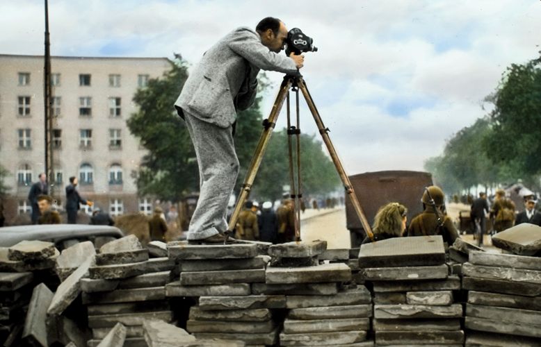 Obléhání Varšavy německými silami v září 1939: Americký fotograf Julien Bryan natáčí scénu během obléhání Varšavy. Stojí na barikádě z dlažebních kamenů, která byla postavena, aby zpomalila postup německé armády. Barikáda stála poblíž Praského nemocnice ve Varšavě (kolorováno)