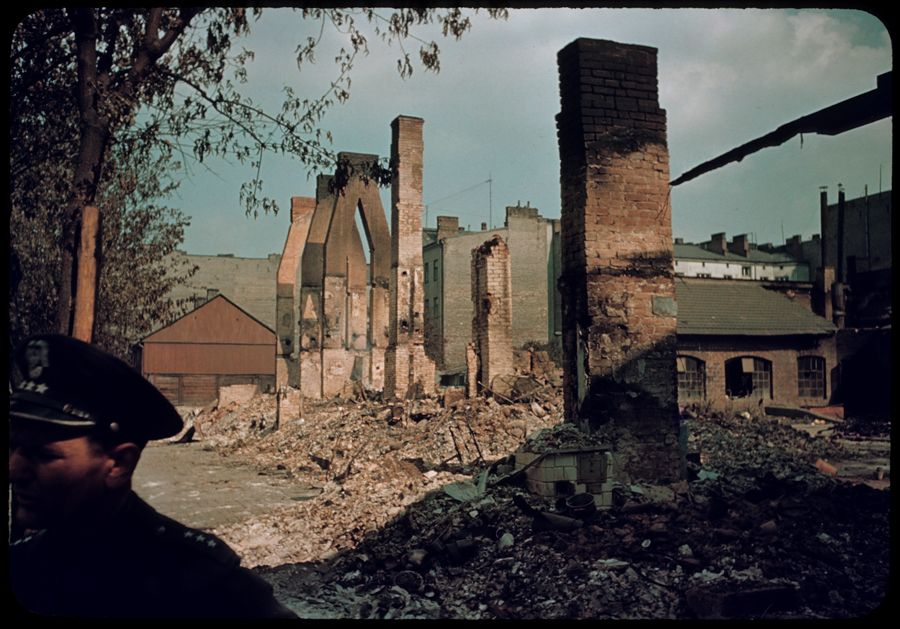 Trosky Varšavy, fotografováno Bryanem, v popředí polský voják