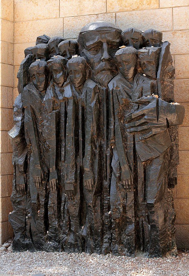 Slavné sousoší Korczaka a dětí na Židovském hřbitově ve Varšavě. Zobrazuje je, jak jdou k transportu…