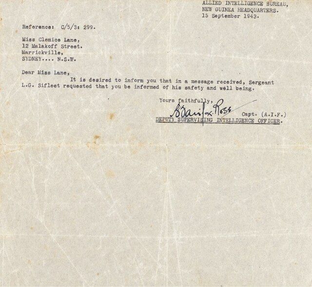 Mezitím doma v Austrálii bombardovala zoufalá Leonardova snoubenka Clarice armádu dopisy: „Co je s ním? Nemám žádné zprávy!“ Jako odpověď obdržela Clarice Lane dva dopisy od Spojeneckého zpravodajského úřadu, které ji ujišťovaly, že Siffleet je „v bezpečí a v pořádku.“ Jenže nebyl. Ani zdaleka. Velitelé věděli, že je pravděpodobně mrtev, zapsali si, že padl v boji - ale on ještě žil.