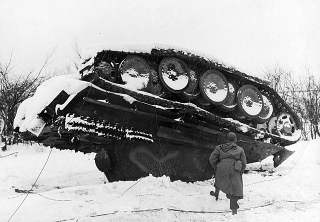 Převrácený německý tank Panzer V Panther u Houffalize v Belgii