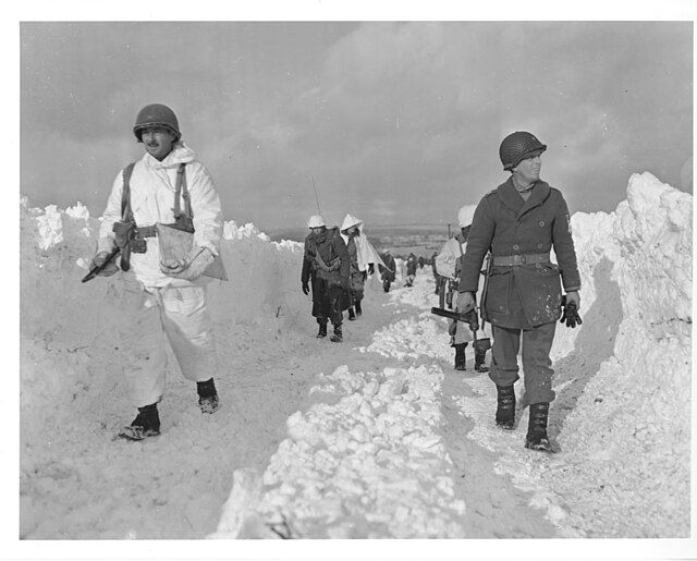 Američtí vojáci v Ardenách, všimněte si výšky závějí. „Jako kdyby se proti nám všem spiklo i počasí. Příroda se na to zvěrstvo nemohla dívat!“ říkali