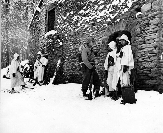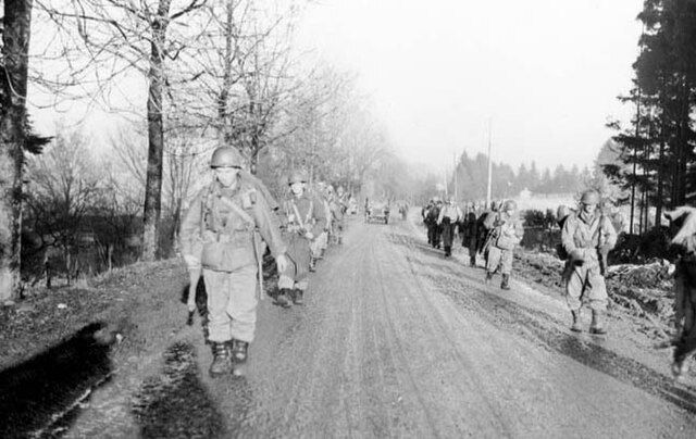 Vojáci 551. výsadkového pěšího praporu postupovali na bojovou linii na začátku bitvy v Ardenách během druhé světové války. Pak se počasí obrátilo.