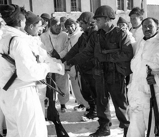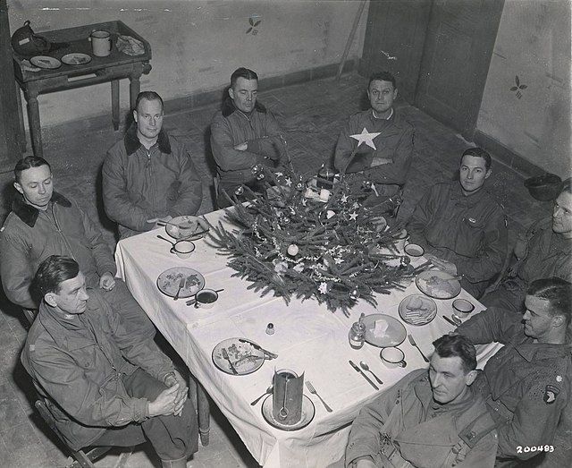 Fotka z příměří samozřejmě neexistuje. Tato pochází také z roku 1944 ze Štědrého večera v americkém štábu poblíž spojenecké linie za Ardenským lesem