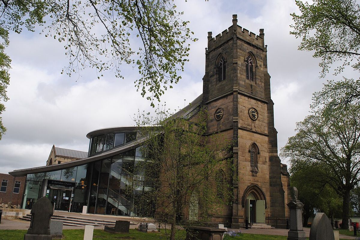 Kostel svatého Barnabáše v Erdingtonu. Byla tam sloužena mše za Barbaru