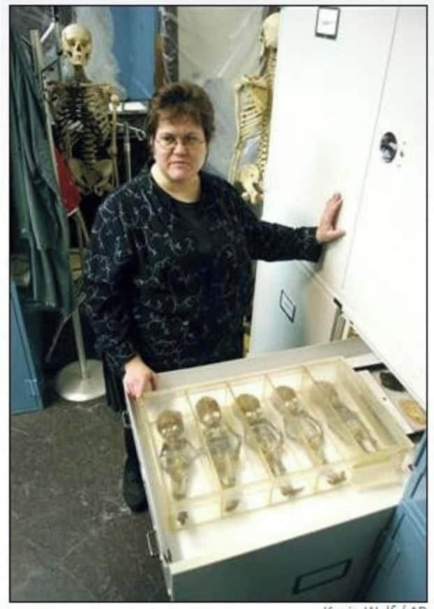 Kurátorka muzea s tělíčky paterčat. Podívejte, jak jsou maličká. Nyní je mohou vidět jen vědci a studenti - na speciální propustku se čeká i roky