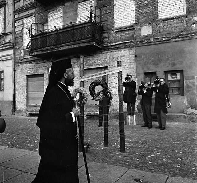 Kolorovaná fotografie domu na ulici Bernauer 48, odkud skočila Ida, rok 1965. V popředí je vidět improvizovaný památník: věnec a prkna. Zeď vedla z druhé strany domu, dům byl „východní“, ale chodník na této straně „západní“. Proto ta zazděná okna. Ida reálně Berlínskou zeď nepřeskočila, ale říká se jí tak. ŽENA, KTERÁ SE POKUSILA PŘESKOČIT ZEĎ. Symbolické označení jejího skoku se vžilo, evokuje onu touhu po svobodě, zvláště proto, že byla první obětí Berlínské zdi.