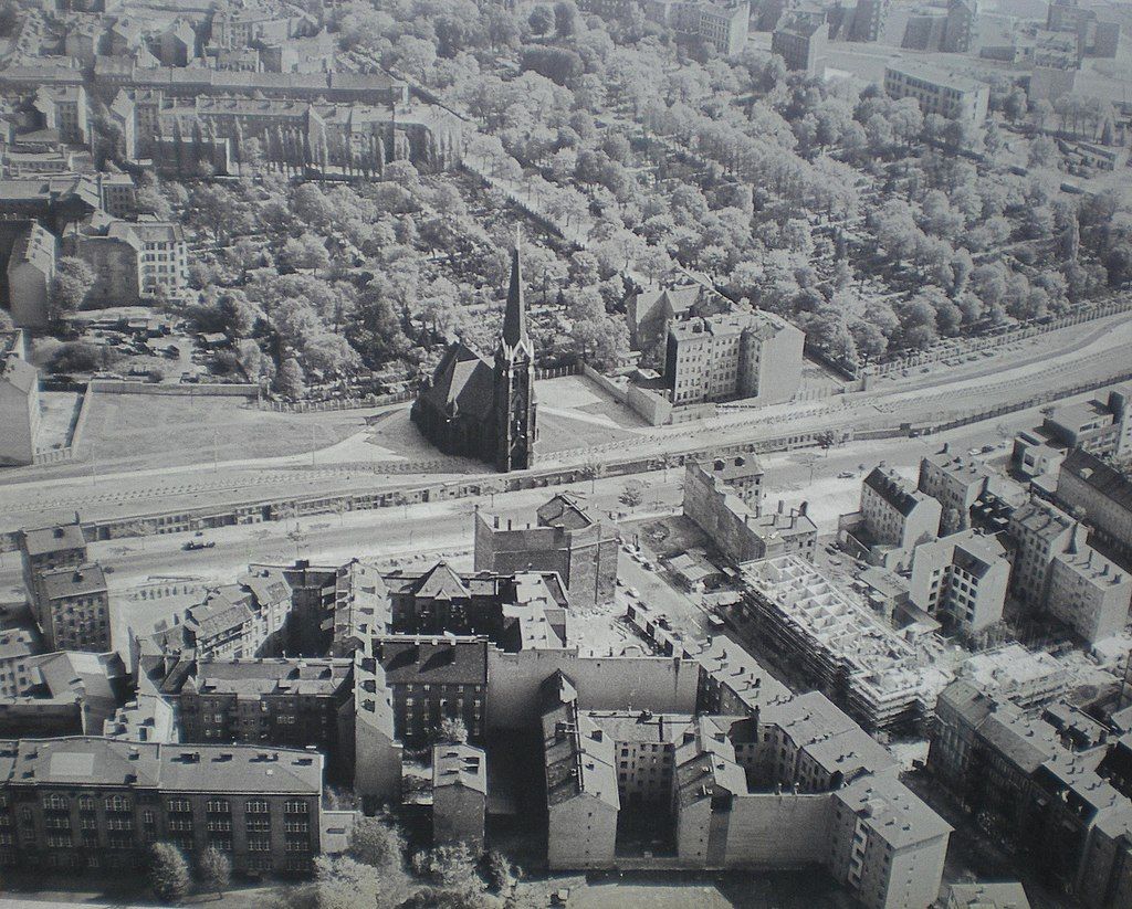 Letecký pohled na Bernauer Straße ukazující zeď a „pás smrti“ za zdí uvnitř východního Berlína. Přímo ve východním Berlíně se nachází Versöhnungskirche neboli Kostel smíření, který byl později zbourán.