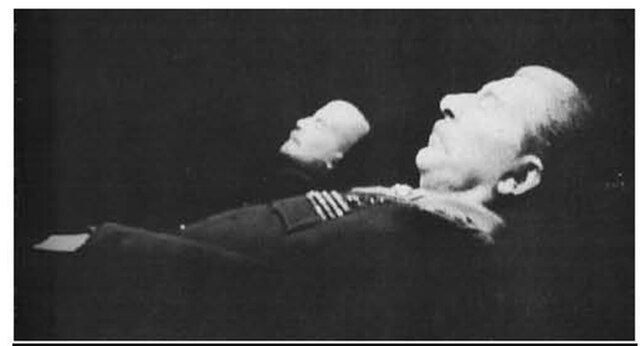 Jedna z mála dochovaných fotek Lenina a Stalina, když ještě leželi mrtví vedle sebe… V rámci tzv. „destalinizace“ rozhodl Nikita Chruščov, že masový vrah Stalin nemá vedle „otce zakladatele“ co pohledávat. Stalinovo tělo bylo v noci tajně vyneseno, zbaveno zlatých knoflíků a metálů a pohřbeno u Kremelské zdi (kde leží dodnes).
