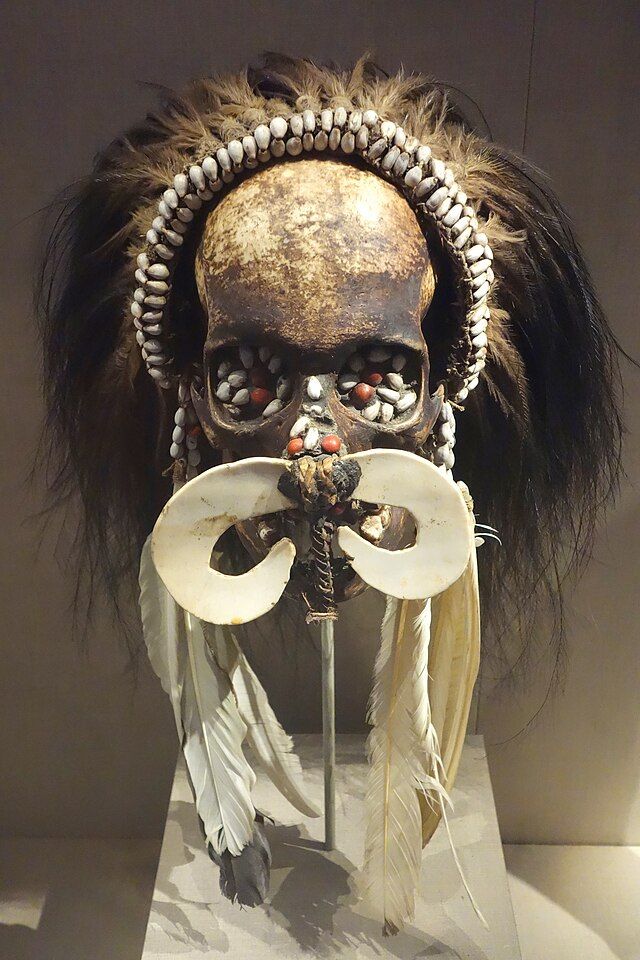Asmatská rituální trofej - lebka snědeného nepřítele, muzeum v Amsterodamu