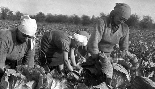Fotka má popisek: Sklizeň zelí na kolchozu v oblasti Ukrajiny. Veselé ženy radostně sklízejí bohatou společnou úrodu