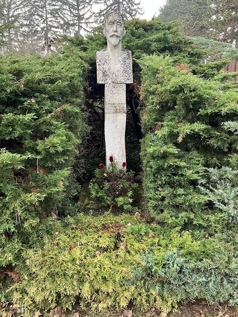 Aloisův prázdný vykradený hrob na Ústředním hřbitově v Brně s bustou