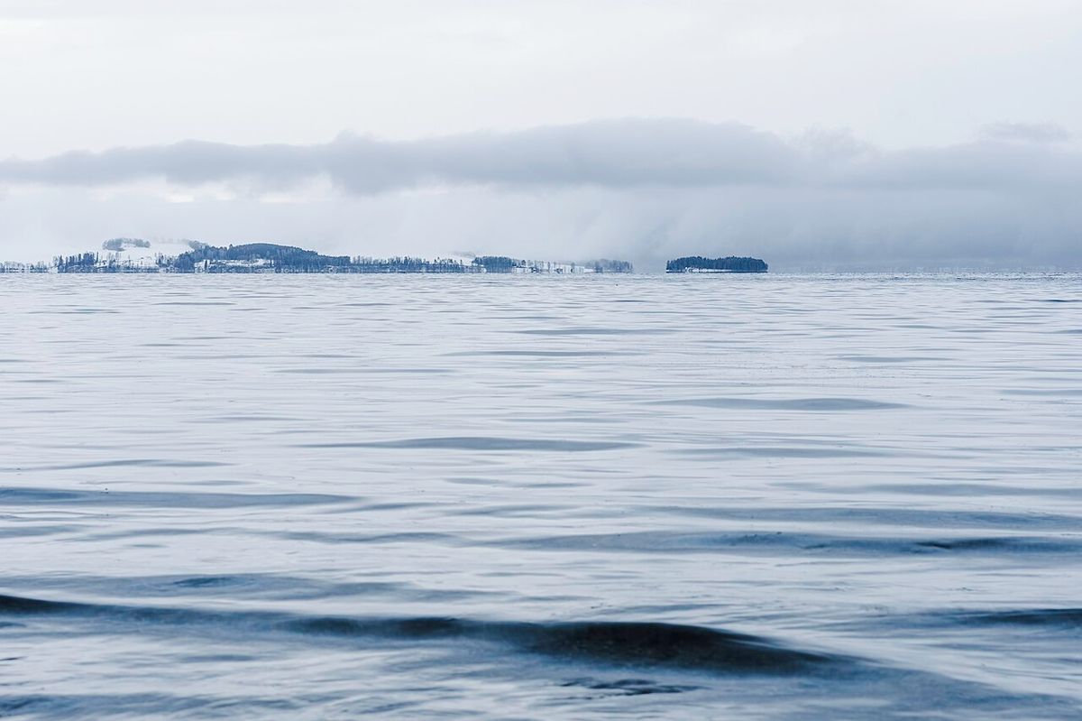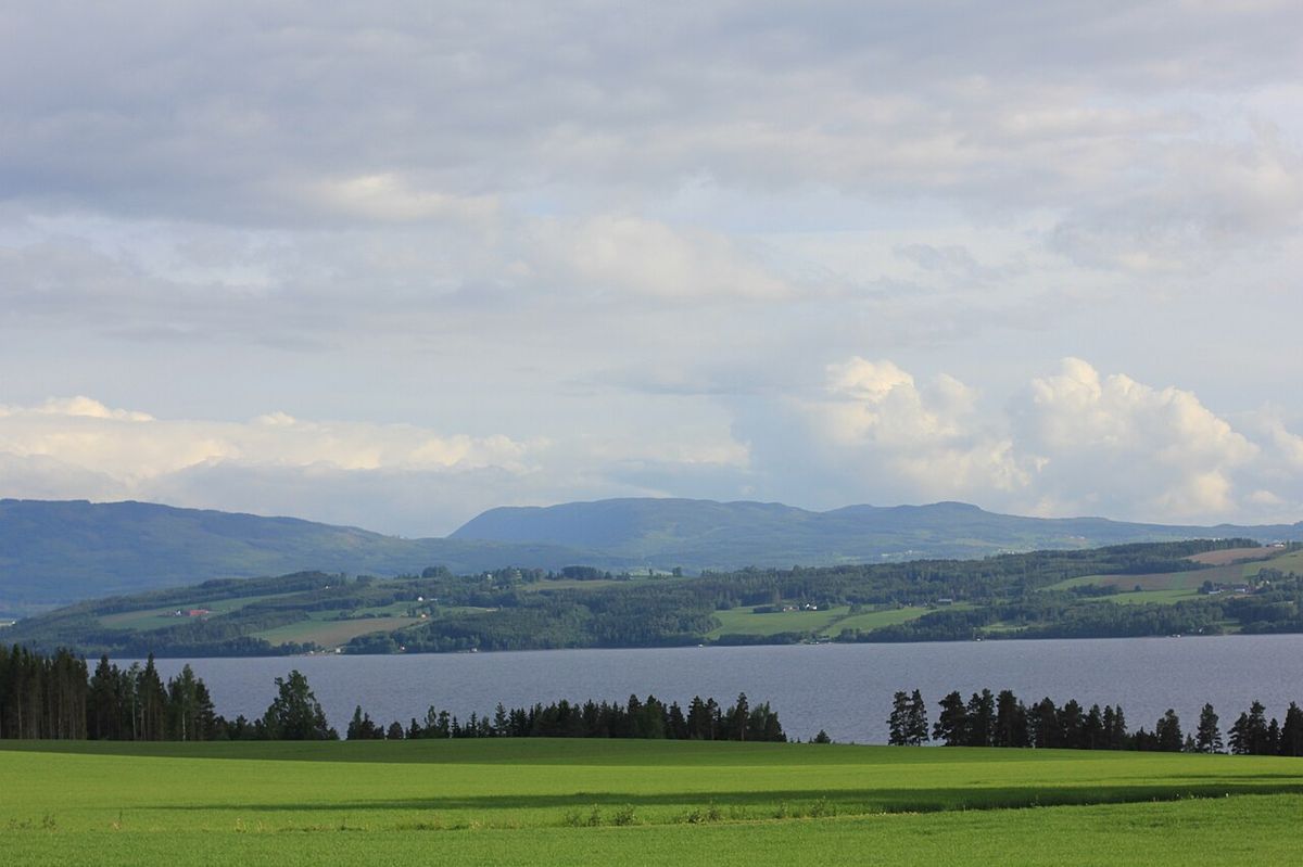 Jezero Mjøsa s pevninou ostrova na obzoru