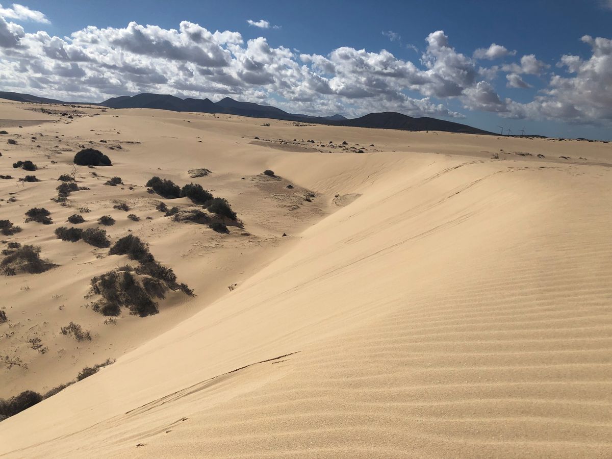 Písečné duny Parque Natural de Corralejo se ztrácí v dálce, jejich měkké linie a teplý písek tvoří poklidný protiklad drsné lávové pustiny.