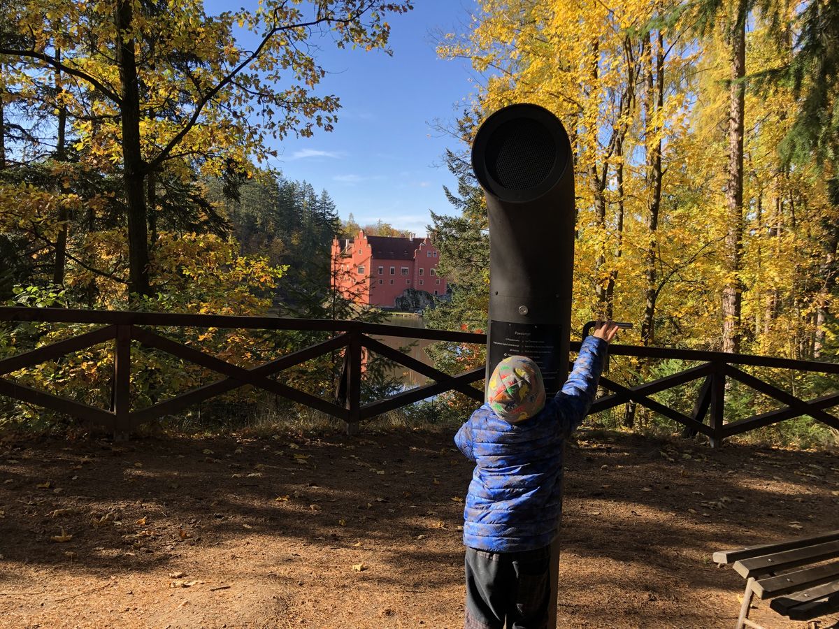 V parku stojí také kaple Nejsvětější Trojice, do které se dá krátce nahlédnout. A naše srdcovka? Jednoznačně Poesiomat. Takový nenápadný tmavý sloupek s klikou. Po zatočení přehraje úryvky z básní, písní nebo filmů spjatých s Červenou Lhotou. Právě odsud se můžete během kulturní vložky kochat nejkrásnějším výhledem na zámek a nechat děti volně běhat kolem.