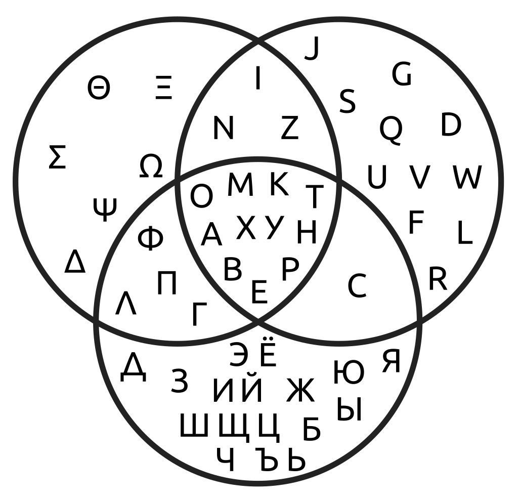Vennův diagram zobrazující řeckou (vlevo), cyrilici (dole) a latinskou (vpravo) abecedu, které sdílejí mnoho stejných písmen, i když mají odlišnou výslovnost.