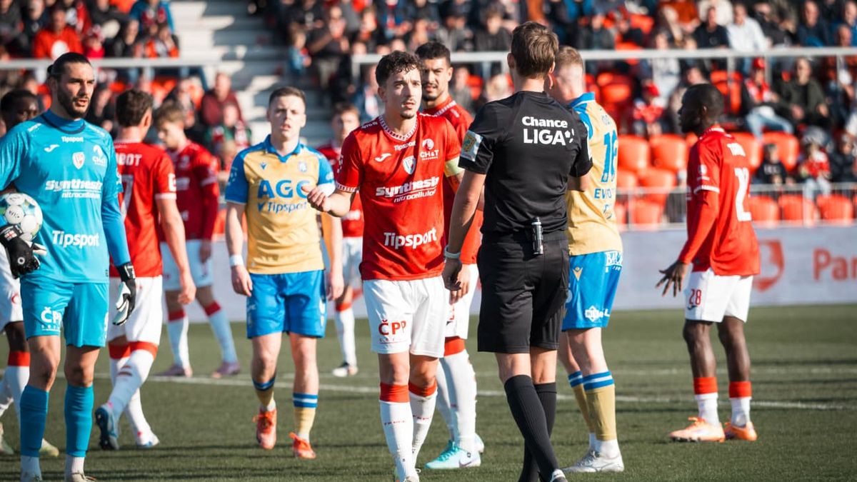 Stav mezi oběma mužstvy byl nerozhodný a utkání probíhalo poklidným tempem. Jeden z nejmladších sudích Chance Ligy Jan Beneš doposud v utkání udělil dvě žluté karty a oprávněně po intervenci VAR vyloučil Jana Fortelného (27) za faul zezadu na domácího Hlavatého.