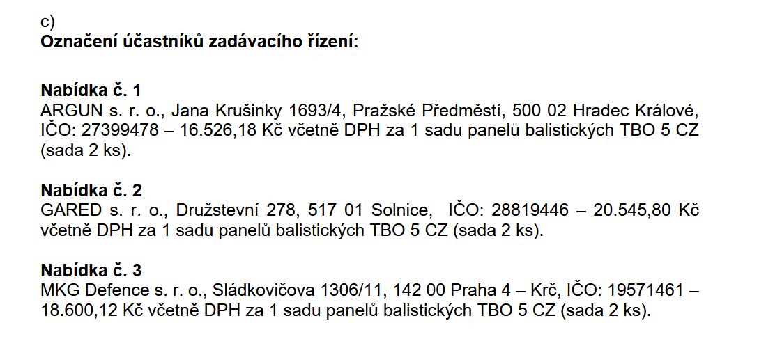 Do výběrového řízení se přitom přihlásili i výrobci a dodavatelé, kteří prokazatelně na trhu existují desítky let, potřebné licence drží a s vojenským materiálem obchodují v tuzemsku i v zahraničí. Jeden z těchto dodavatelů navíc nabídl nižší cenu než výherce, ale opět za nejasných okolností došlo k preferenci firmy MKG Defence s.r.o., která sídlí v panelovém domě v pražské Krči.