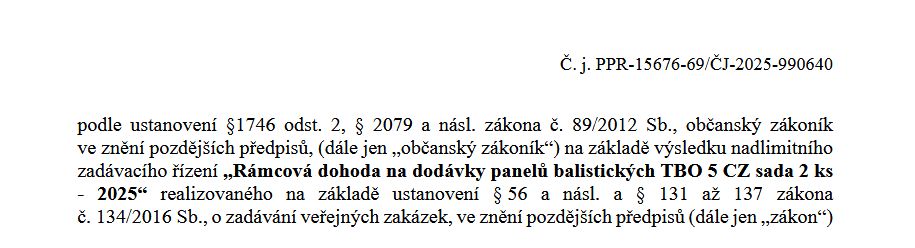 Aby bylo možné historii této zakázky, která se zabývá dodávkou kritického materiálu pro přežití příslušníků policie v krizových situacích, je třeba se vrátit do února roku 2025, kdy Policejní prezidium vypisuje výběrové řízení s názvem Rámcová dohoda na dodávky panelů balistických TBO 5 CZ sada 2 ks.