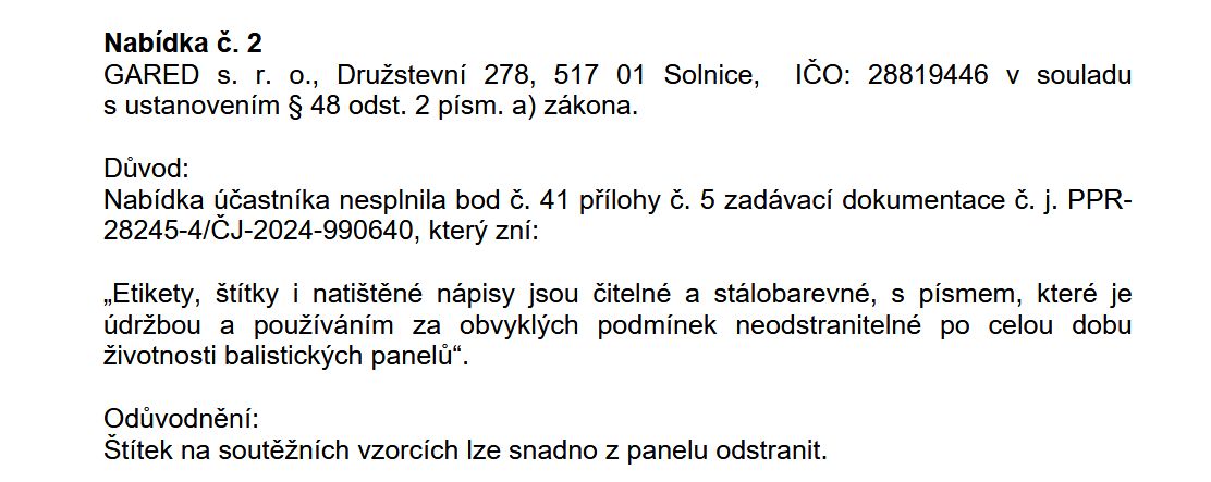 Soutěž proběhla a zakázku mezi sebou soutěžili tři dodavatelé, firma ARGUN s.r.o., společnost GARED s.r.o. a konečně firma MKG Defence s.r.o. Všichni zmínění byli ze soutěže diskvalifikováni pro více či méně závažné prohřešky. Firma GARED s.r.o. byla například diskvalifikována proto, že její barevný štítek umístěný na vestě lze ve vlhkém odstranit. Ano, policie nenapsala dodavateli, aby vesty potiskl více odolným štítkem, který nemá s průrazností a ochranou životů vůbec nic společného, ale firmu policisté jednoduše diskvalifikovali, ačkoli jde o dodavatele s dekádami historie a stamilionovými tržbami.