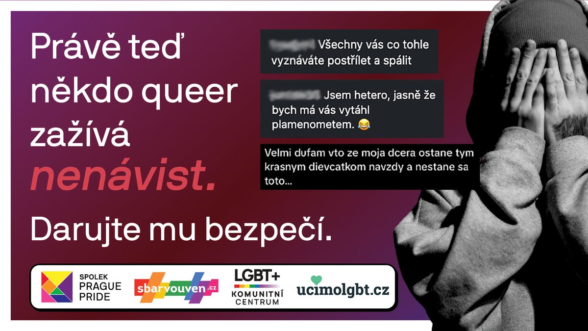 I takhle vypadá život LGBTQ+ lidí v Česku v roce 2025. Proto organizace Prague Pride spouští kampaň Právě teď někdo queer zažívá nenávist. Darujte mu bezpečí, jejímž cílem je zajistit finance na pokračování tří programů, jimiž negativní prožitky queer obětí násilí kompenzuje – online poradny a podpůrných skupin sbarvouven.cz, LGBT+ Komunitního centra v Praze a vzdělávacího projektu pro vyučující Učímolgbt.cz.
