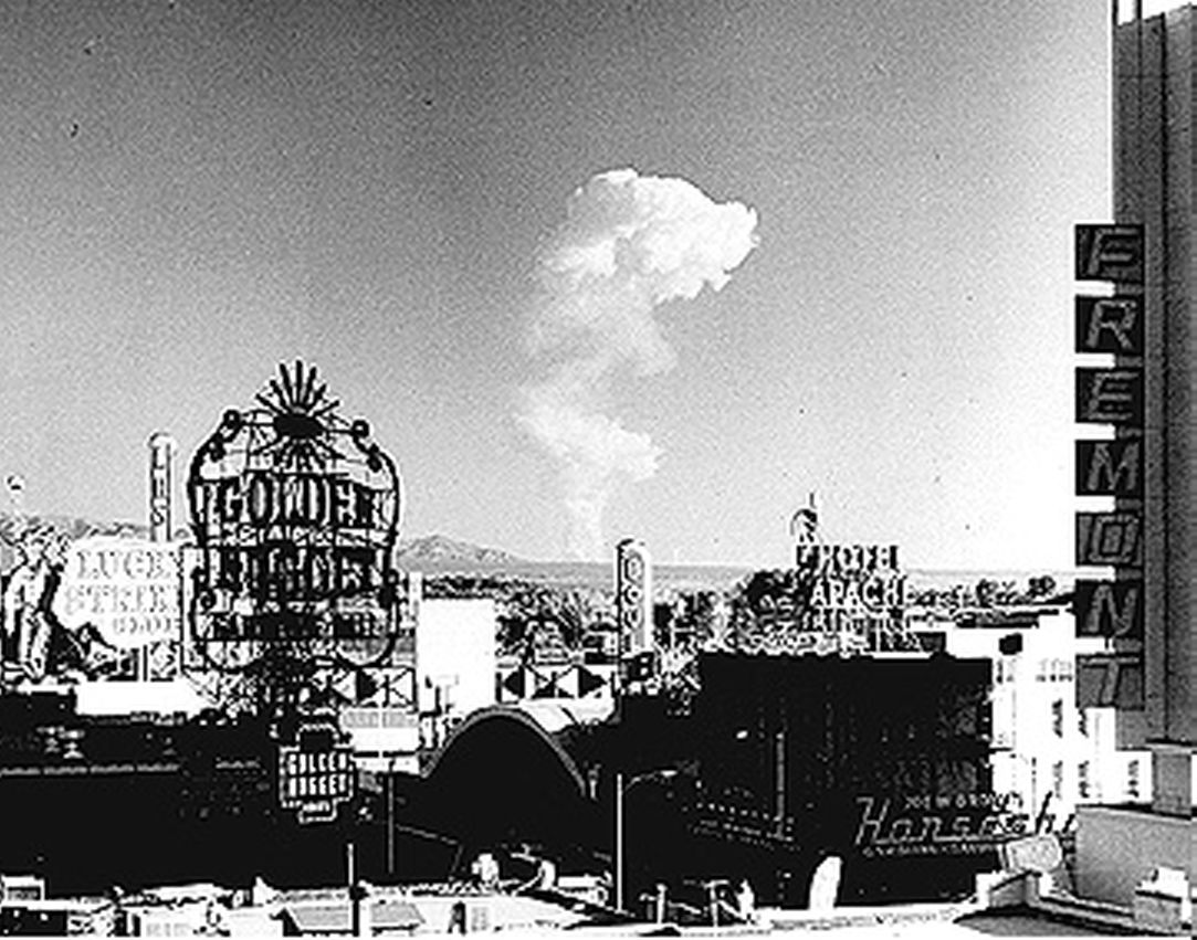 Pohled na centrum Las Vegas ukazuje v pozadí hřibovitý jaderný mrak. Takové scény byly typické pro 50. léta 20. století.