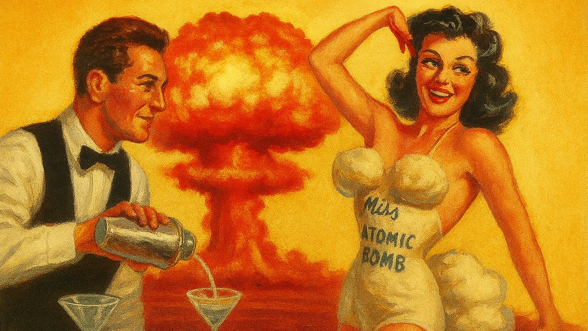 Takže – v padesátých letech mohl Američan koupit hračku s uranem, sednout na střeše hotelu v Las Vegas s koktejlem v ruce a „užít si výbuch jako show“. Bylo to období, kdy destrukce byla prokládána glamourem a jaderný hřib nebyl varováním, ale dekorací. A teď si představte dnešek: místo „Dawn Bomb Parties“ bychom asi pořádali „Doom Town TikTok Explosions“ – turisté by natáčeli Hřiba do Reels, barmani by míchané drinky nazvali „Radioactive Sunrise“ a děti by si objednávaly mikroskopy, aby sledovaly, jak elementární částice tančí v mlžné komoře.