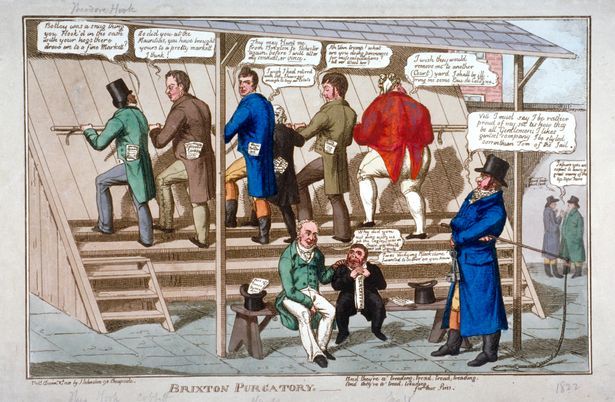 Satira zobrazující vězně, mezi nimiž jsou významné osobnosti té doby jako W. Cobbett, H. Hunt a T. Wooler, na běhacím pásu v brixtonské věznici.