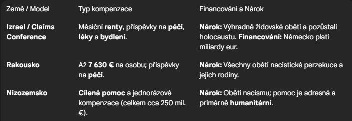 - Izrael / Claims Conference: Německo platí miliardy eur na podporu židovských obětí. Kompenzace jsou vypláceny ve formě měsíčních rent, příspěvků na péči, léky a bydlení. Nárok mají výhradně židovské oběti holocaustu a jejich pozůstalí.