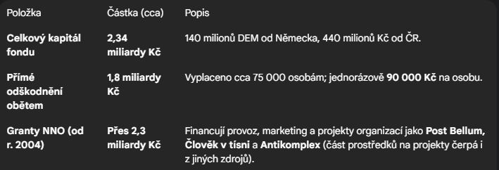 Celkový kapitál fondu ČNFB činil zhruba 2,34 miliardy Kč (140 milionů DEM od Německa, 440 milionů Kč od ČR). Na přímé odškodnění obětem bylo vyčleněno pouze 1,8 miliardy Kč pro cca 75 000 osob, přičemž každá oběť obdržela jednorázově přibližně 90 000 Kč. Zbývající stovky milionů korun plus úroky z kapitálu byly následně převedeny do grantového systému. Od roku 2004 rozdělil ČNFB na granty přes 2,3 miliardy Kč, přičemž hlavními příjemci se staly neziskové organizace, jako jsou Post Bellum, Člověk v tísni a Antikomplex. Tyto prostředky financují provoz, marketing a paměťové projekty, které ale nepřináší obětem ani jejich rodinám žádný hmatatelný užitek. Jedna organizace tak může z fondu získat více, než kolik bylo vyplaceno stovkám obětí dohromady. Systém preferuje institucionální zájmy před potřebami jednotlivců.