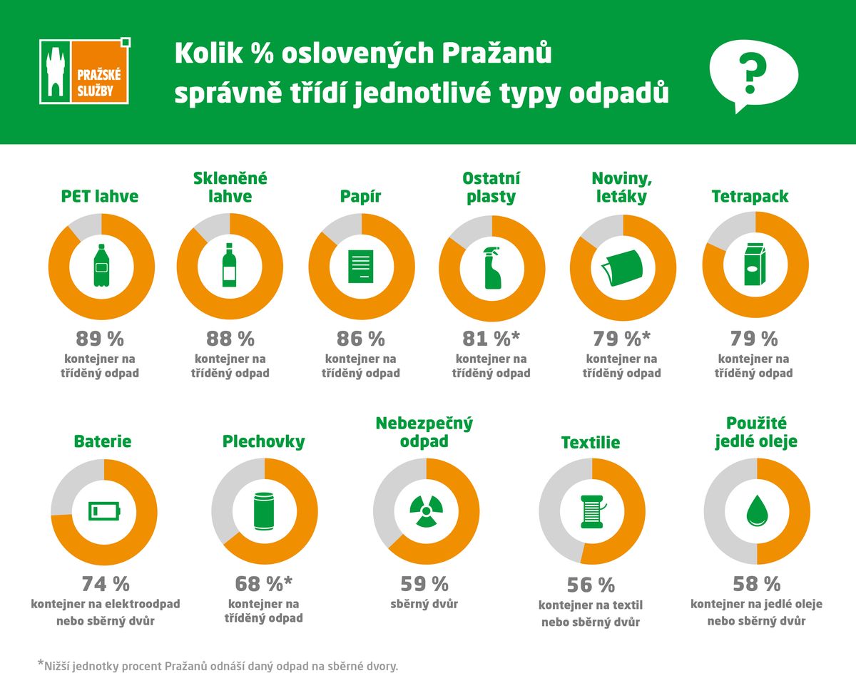 Pražané třídí zejména PET lahve, do žlutých popelnic je nosí 89 procent dotázaných. Dále pak skleněné lahve a papír. Zhruba čtyři pětiny lidí správně vyhazují do barevných nádob také ostatní plasty, tiskoviny, nápojové kartony nebo například kovové obaly.