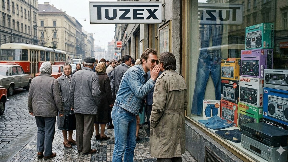 Představte si, že je polovina 80. let a vy jdete po šedivé pražské ulici. Najednou se před vámi otevře výloha, která vypadá jako z jiného vesmíru. Za sklem nejsou jen obyčejné hračky nebo oblečení, ale barevné krabice s nápisy v angličtině, japonská elektronika a džíny, které mají ten správný střih. Nad vchodem svítí modrobílé logo podniku Tuzex.