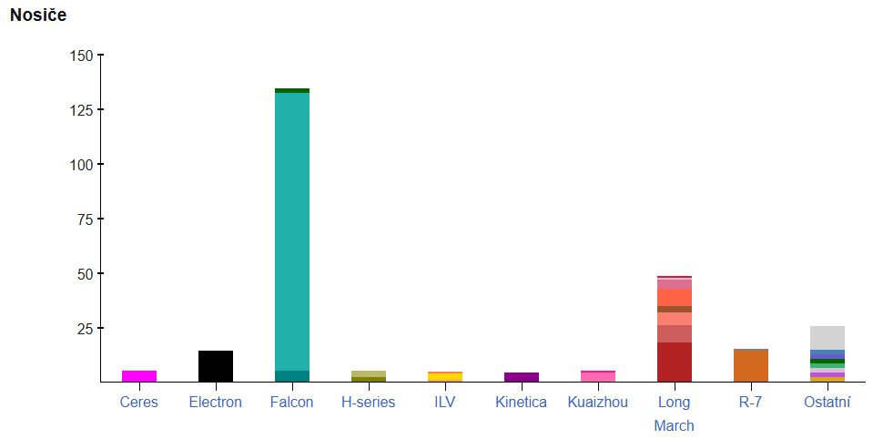 V loňském roce byl opět nejúspěšnějším nosičem Falcon 9 společnosti SpaceX (132 startů). 127 startů bylo provedeno s prvním stupněm, který byl již předtím minimálně jednou použit, pouze 5 misí využilo zbrusu nový stupeň. Na druhém místě se opět objevila rodina čínských raket Dlouhý pochod, a to se 49 starty.