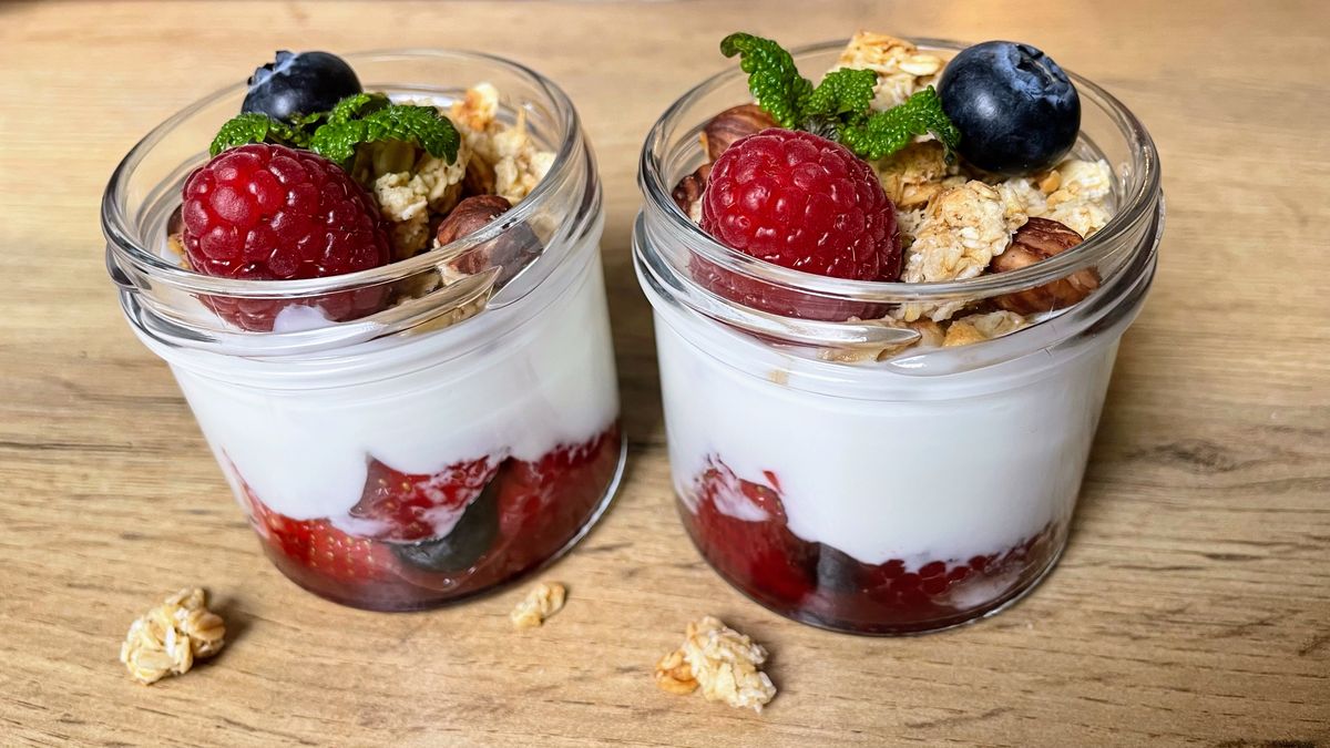 - Základ: Hustý bílý jogurt (min. 3 % tuku) jemně slazený medem.