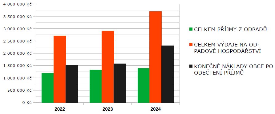 - Náklady na systém OH stále rostou. Od roku 2022 vzrostly konečné náklady téměř o 47 % a celkové výdaje obce o více než 27 %. Lze přitom očekávat, že tento trend bude pokračovat – vlivem vyšších sazeb za skládkování, růstu cen služeb a možného dalšího nárůstu produkce odpadu.