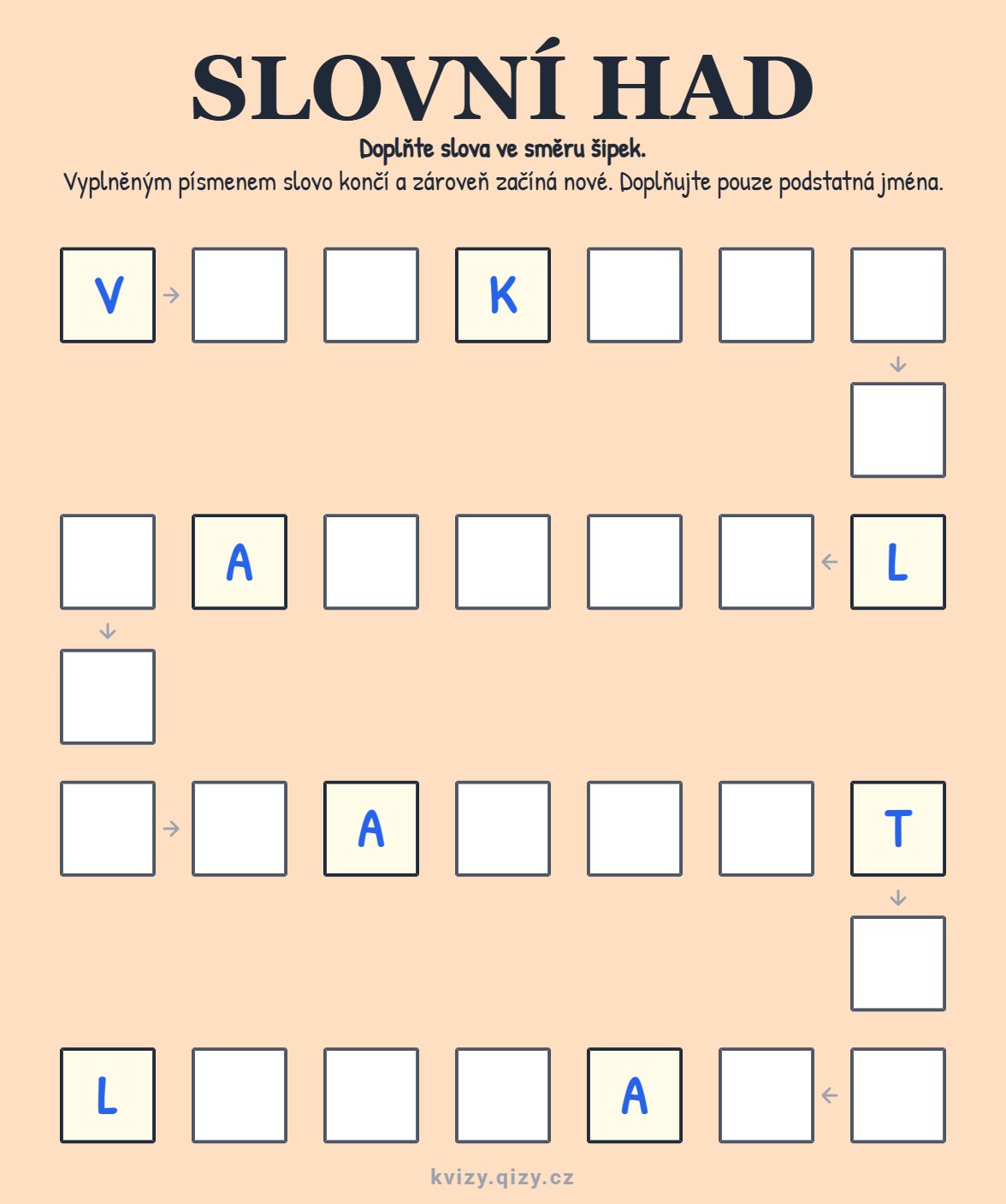 Na obrázku níže je slovní had, kde musíte doplnit slova tak, aby každé slovo končilo na písmeno, kterým začíná slovo následující. Vaším úkolem je najít správná slova, která do hádanky pasují. Slova postupují ve směru šipek, které vás provedou celým hlavolamem. K doplnění můžete použít pouze podstatná jména. Zkuste to vyřešit co nejrychleji!