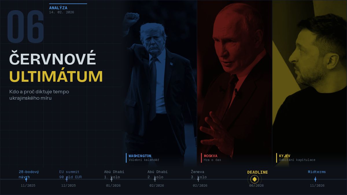 Osud Ukrajiny se pravděpodobně rozhodne v roce 2026, nikoli na bojišti, ale ve střetu tří protichůdných politických logik: Trumpovy potřeby vykázat „vítězství“ před listopadovými volbami do Kongresu, Putinovy existenční hry o přežití režimu a Zelenského odmítání kapitulace maskované jako mír. Zelenskyj 7. února 2026 oznámil novinářům (s embargem platným do 8. 2.), že Washington dal oběma stranám červnový termín pro ukončení války. Logika tohoto termínu není primárně vojenská ani diplomatická, ale volební. Reuters den předtím na základě několika zdrojů popsal, jak americký vyjednávací tým Witkoff–Kushner varoval ukrajinské protějšky, že Trumpův manévrovací prostor se s blížícími se volbami zužuje. Jak shrnul Fareed Zakaria ve Washington Post (sloupek, prosinec 2025): „Volba není mezi mírem a válkou. Je mezi mírem, který zabrání příští válce, a mírem, který ji naplánuje.“