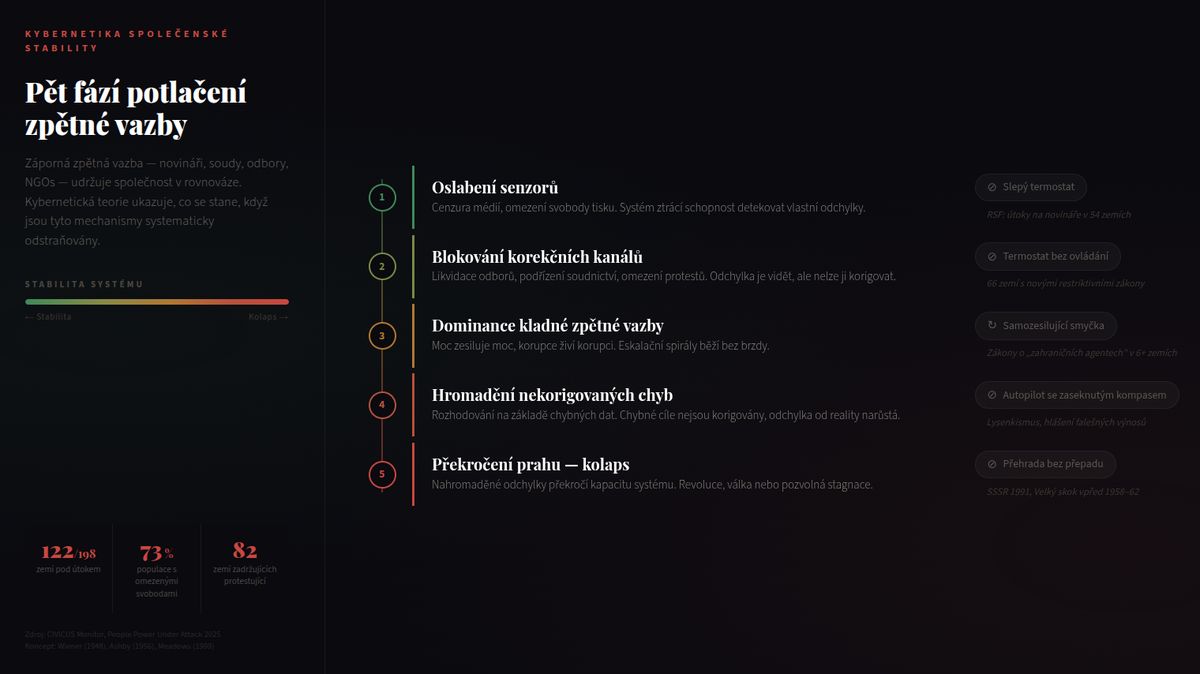 Fáze 2 — Blokování korekčních kanálů: Omezení protestů, likvidace odborů, podřízení soudnictví. Systém detekuje odchylku, ale nemůže ji korigovat. Analogie: termostat, který vidí teplotu, ale nemůže ovládat topení.