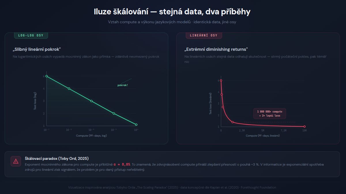 V informatice se exponenciální spotřeba zdrojů pro lineární zisk obvykle považuje za signál, že problém je pro daný přístup neřešitelný. Ord argumentuje, že přesně to nám škálovací zákony říkají — jen to prezentují na grafech, které tuto skutečnost vizuálně maskují.