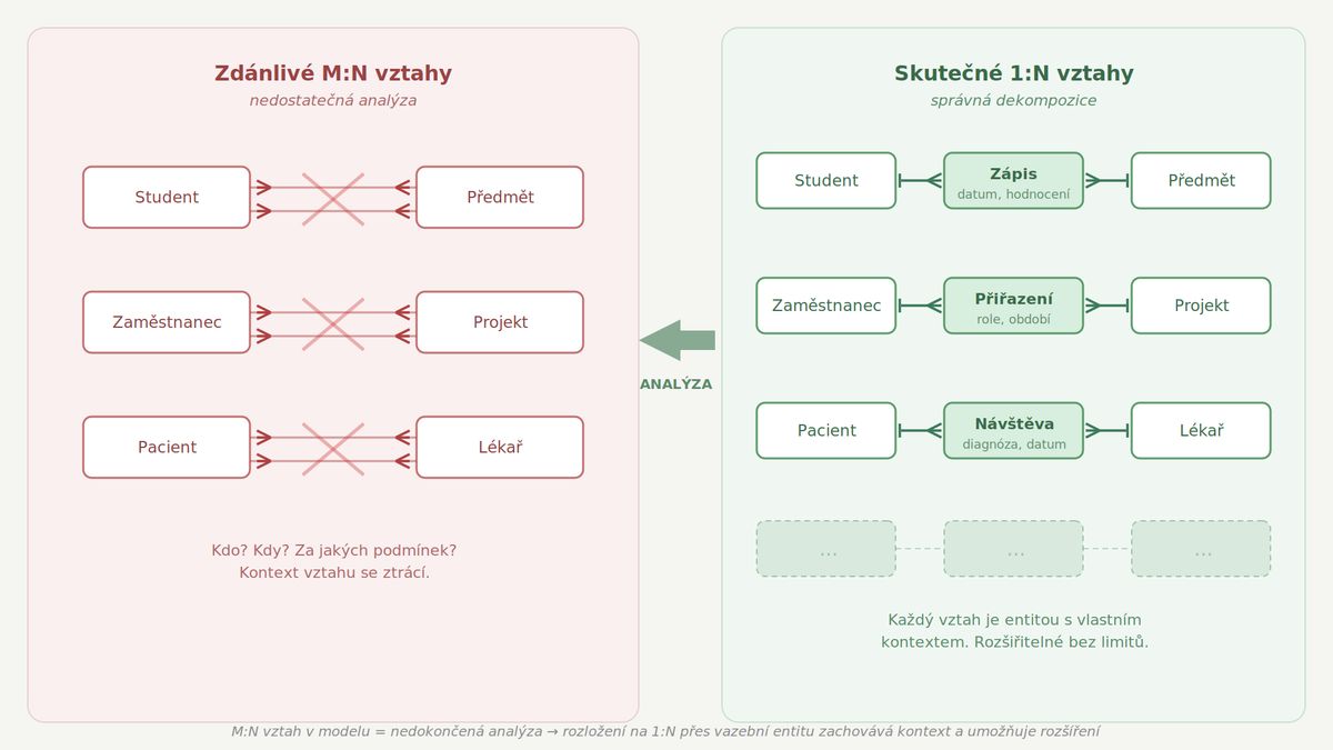 Každý zdánlivý M:N vztah je ve skutečnosti dvěma vztahy 1:N, propojenými přes dosud neidentifikovanou entitu, která nese vlastní atributy a vlastní identitu.