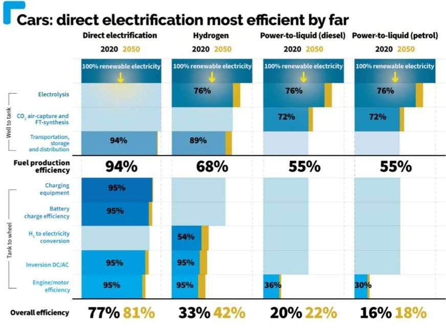 V souvislosti s úpravou pravidel pro vozidla se opět zvedlo téma tzv. e-paliv. Ta se vyrábí následovně. Na začátku se z přebytkové elektrické energie vyrobí vodík, se kterého se následnou syntézou vyrobí surový olej a další rafinací se pak vyrábí konkrétní produkt pro pohon vozidel. Výsledkem je hotové e-palivo, které má chemické vlastnosti shodné s fosilními palivy a lze jej použít v existujících motorech a infrastruktuře. Z energetického hlediska to vypadá následovně. Litr nafty obsahuje asi 10kWh energie. Na jeho výrobu je potřeba při započtení všech účinností asi 20kWh primární elektřiny.