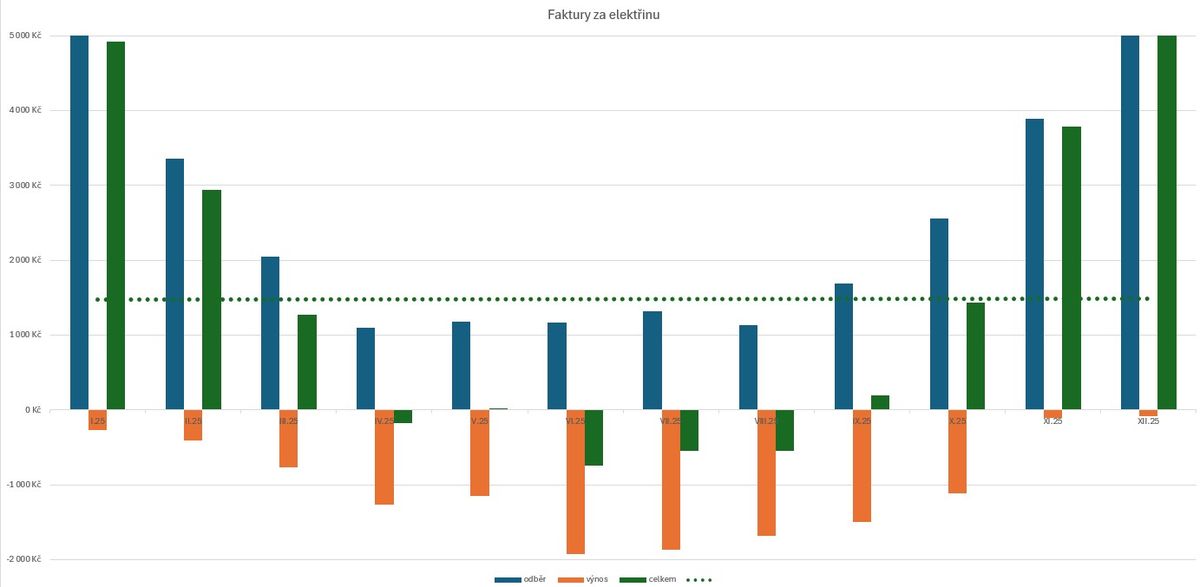 Rok 2025 již proběhl celý také v režimu spotového nákupu elektřiny. Spotová cena elektřiny v průběhu denní a roční doby značně kolísá. Maxima se pohybují i nad 10Kč/kWh a v letním období nejsou výjimkou doby s nulovou, nebo zápornou cenou elektřiny. Podstatný je ale průměr za celý rok a ten dosáhl hodnoty okolo 3,8 Kč/kWh včetně distribučních poplatků.