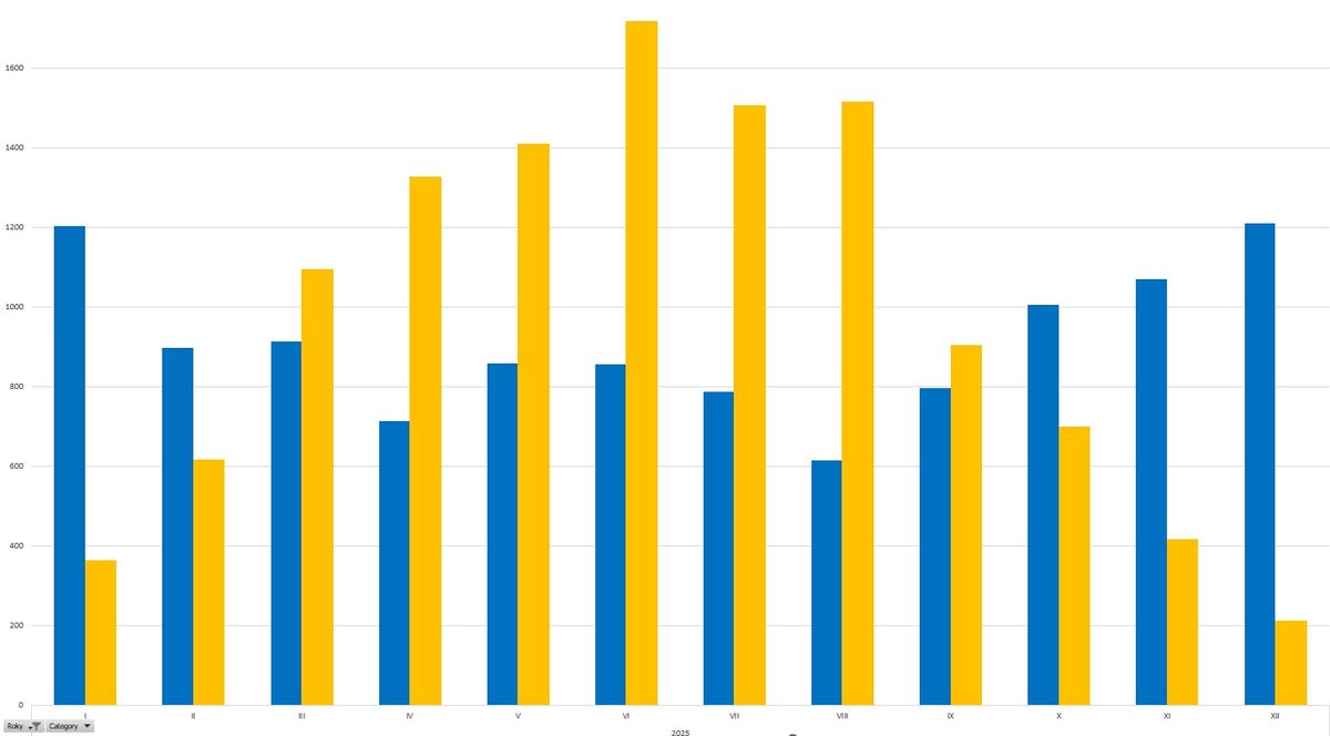 Průběh výroby a spotřeby - 2025, žlutá: výroba, modrá: spotřeba