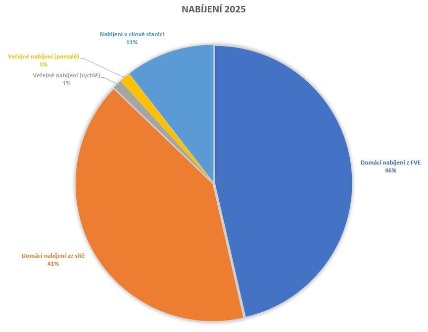 Zhruba 30 % spotřeby v roce 2025 tvořil provoz dvou elektromobilů. Na celkový nájezd vlastního auta 15 500 km bylo nabito přes 2400kWh doma a dalších 400kWh mimo domov. Necelých 50 % nájezdu tak tvoří nabíjení z FVE, 40 % nabíjení doma ze sítě a zbytek pak nabíjení na rychlonabíječkách, nebo v cílové stanici. Nákladově to vypadá následovně. Při nabíjení z FVE je potřeba započítat průměrnou cenu, za kterou by se elektřina dala případně prodat do sítě, což se v ročním průměru dá odhadnout na 1,5 Kč. U nabíjení ze sítě pak kWh včetně distribuce vyšla na zhruba 3 Kč. U rychlonabíječek se v průměru nabíjelo asi za 13 Kč. V celoročním průměru pak vychází kilometr jízdy asi na 50 haléřů, což představuje vůči benzínu úsporu okolo 1,6 Kč/km. Zajímavostí je velice nízký podíl veřejného nabíjení, který za rok dosáhl pouze 2%, přičemž tolik diskutované rychlonabíjení tvořilo pouhé procento nájezdu. Tomuto stavu významně pomáhá rozvoj sítě nabíječek, kdy bylo často využíváno nabíjení v cílové stanici - penziony, restaurace, resp. nabíjení u kanceláře. Druhým aspektem bylo využití druhého auta na dvě dovolené. Jako domácnost potřebujeme auta dvě. Elektromobil je tak využíván na většinu kratších, ale i středně dlouhých cest. Starší spalovací vůz slouží jako druhé auto do rodiny a je využíván například na dovolenou.