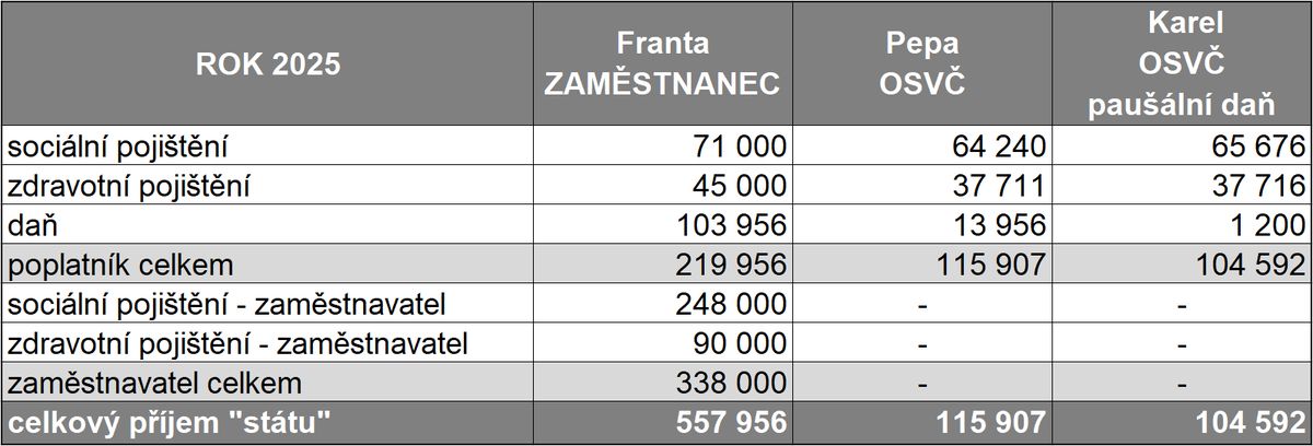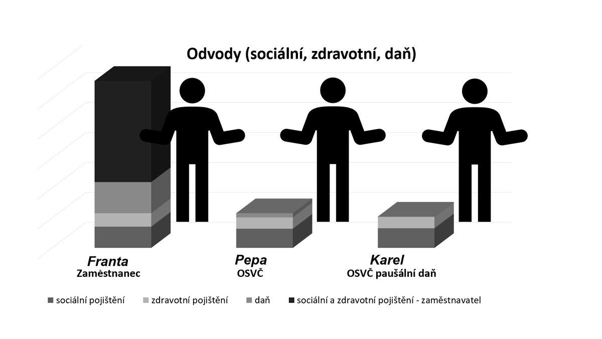 Prozkoumejme spolu příklad tří pánů - zaměstnance, OSVČ a OSVČ s tzv. paušální daní. Říkejme jim třeba Franta, Pepa a Karel a mějme je rádi všechny stejně.