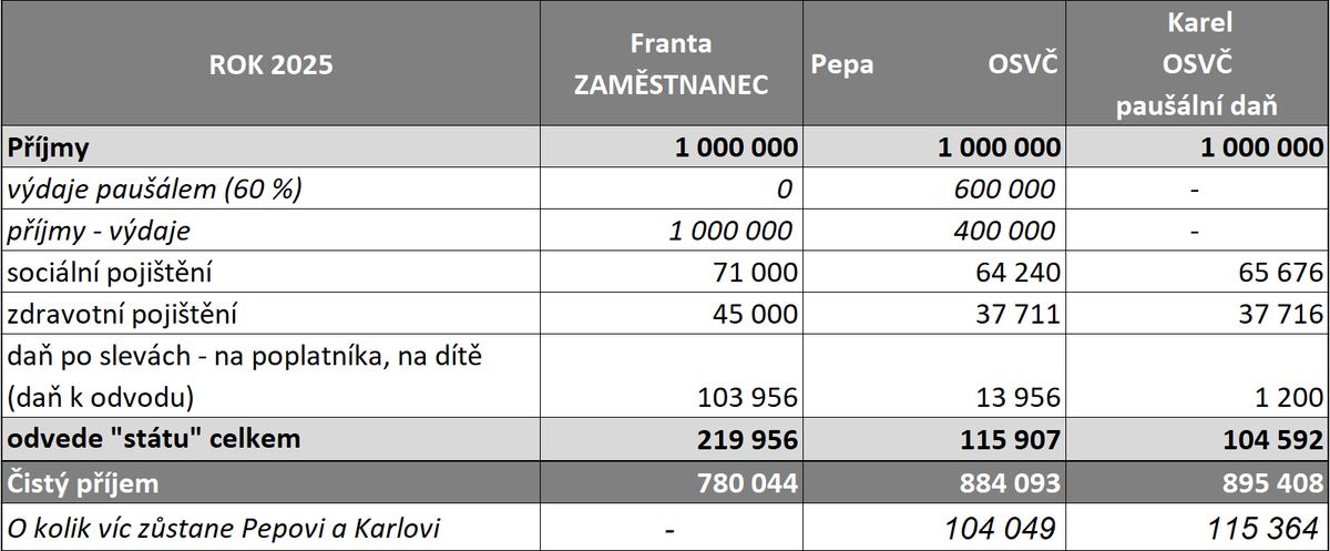 Karlovi (OSVČ, paušální daň) najednou zůstane ne o 115 tisíc, ale dokonce o 146 tisíc víc než Frantovi (zaměstnanec).*