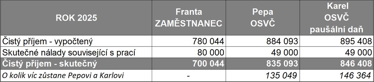 A je to tady, čísla mluví jasně. Někdo tušil, jiný ne a je třeba i maličko překvapen. Každopádně, Karlovi (OSVČ, paušální daň) v kapse zůstane o 115 tisíc víc než Frantovi (zaměstnanec).