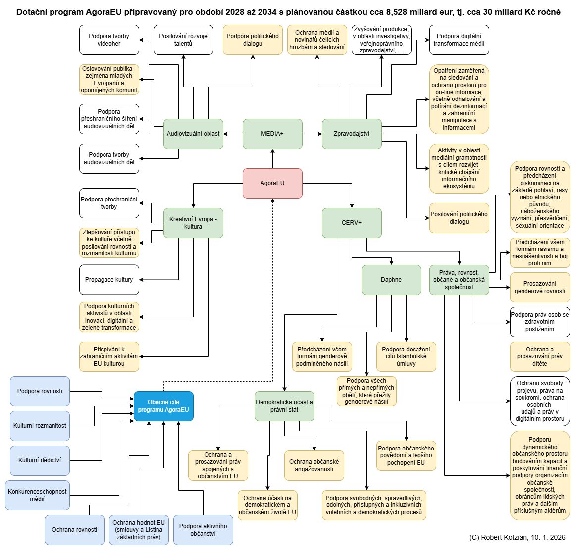 Schéma dotačního programu AgoraEU, který se má od roku 2028 stát hlavním finančním nástrojem Evropského štítu pro demokracii.