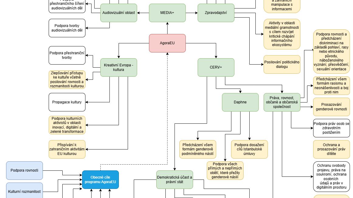 - Avšak všechny složky, tj. každá dotace z programu AgoraEU, vždy bude muset sledovat obecné cíle (modré obdélníky). Tím je vyloučeno, že by mohla být udělena dotace na cokoli, co by vážně kritizovalo podstatu EU nebo lidskoprávní systém EU. Tím je například vyloučeno, aby dotaci získal projekt zabývající se podstatou migrační katastrofy.